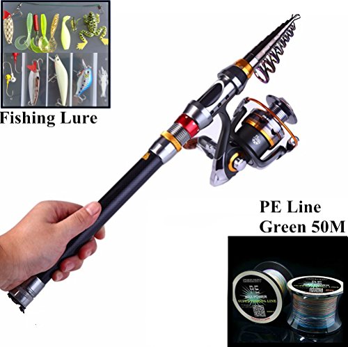 Studio : ECOOLBUY Publisher : ECOOLBUY Binding : Misc. Product Description The Rod: Fishing Rod: Telescopic Fishing Rod Size:2.1m/2.4m/3.0m Close length: Approx. 39cm/42cm/43cm/ Material: 99% Carbon Fiber Alloy 1.More short body with large spool and large line capacity 2.Deep aluminium spool with double color and one line holes 3.Instant anti-reverse 4.Power drive gear equipped for high strength 5.Coiled bail spring 6.S-curve oscillation system for very good line winding 7.Right/left inter-changeable handle 8.Computer balanced rotor 9.High tensile strength plastic body 10.Telescopic finshing rod pole is sensitive graphite blank construction; 11. aluminum oxide guide inserts fishing pole; 12. Stainless Steel Hooded Reel Seats make the fishing rods always brightness cause anti-seawater corrosion; EVA Fore Grip for comfort; 13. Multiple lengths and actions; Made from Carbon Fiber mixed with Fiberglass ,strong and durable; 14. Collapses for easy storage and travel; 15. Suit for: Sea fishing, boat fishing; 16. Several length for you to choose from. The Reel: It is fortified with metal main shaft and components and equipped with 11 ball bearings supporting the main shaft that stabilize the main shaft for precise rotation and give added endurance. Perfect Christmas Gift For our Fisherman Spinning Fishing Reel Series: DK3000 Series Material: Full MetalP66 Body Ball Bearing: 11BB Gear Ratio: 5.2:1 Weight:396g Fishing Bag: Material: 420D oxford fabric camouflage(optional) Length: 20inch (optional) Package Includes: Fishing Rod x1 Fishing Reel x1 Fishing Bag x1 Fishing lures x16 Fishing Line(50m)x1