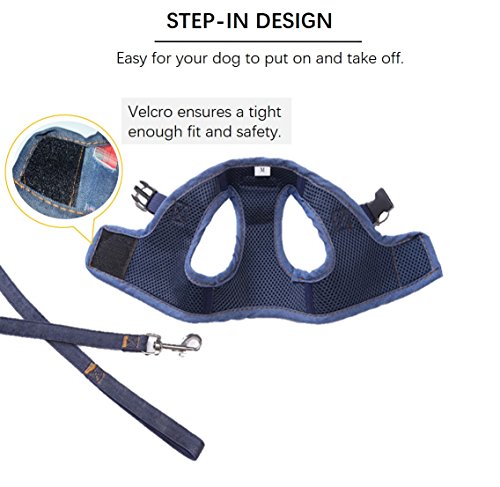 2.Made with Sturdy Material This Vest Harness is made of durable denim and soft padded mesh which keeps your pets' skin scratch-free and comfortable.