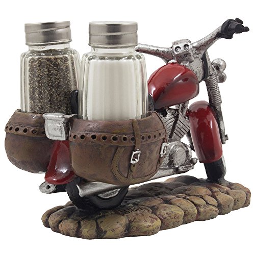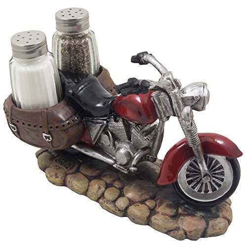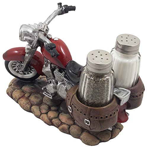 Decorative Red Motorcycle with Glass Salt and Pepper Shaker Set in Saddle Bags for Classic Bike Models & Vintage Chopper Figurines As Biker Bar or Kitchen Table Decor Sculptures and Retro Road Hog Gifts for Harley Riders