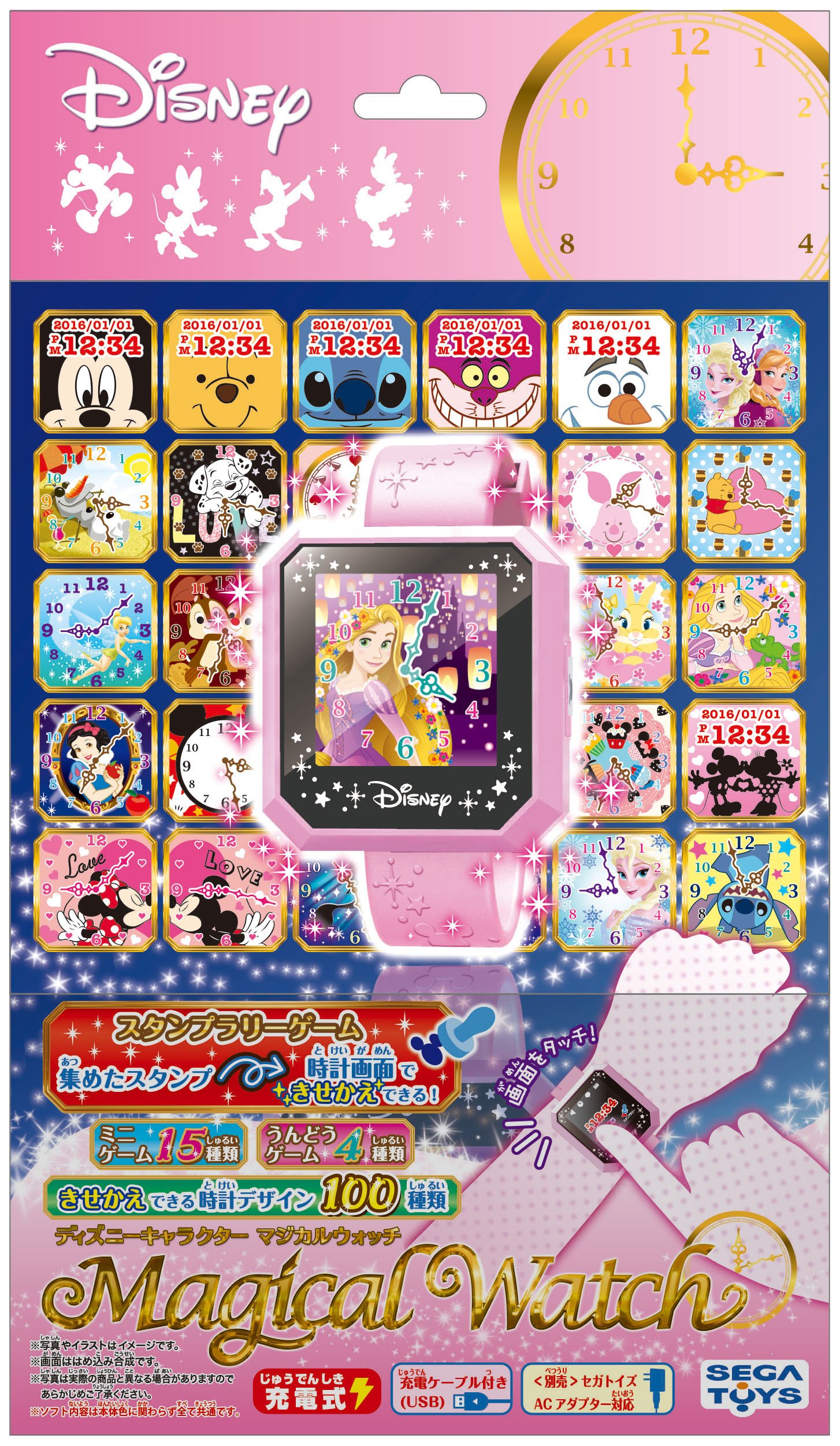 Wearable toys full of Disney characters full of many features such as clocks, games and messages.