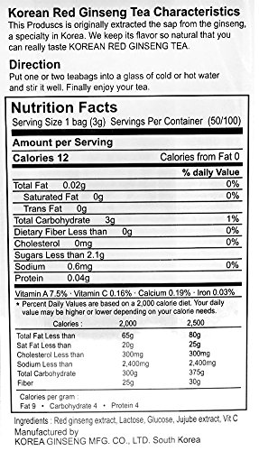-. Feature : Korean Red Ginseng Tea / 100 packets / Product of Korea / Quickly Dissolving Granules for Instant Tea / Put on teabag into a glass of cold or hot water and drink