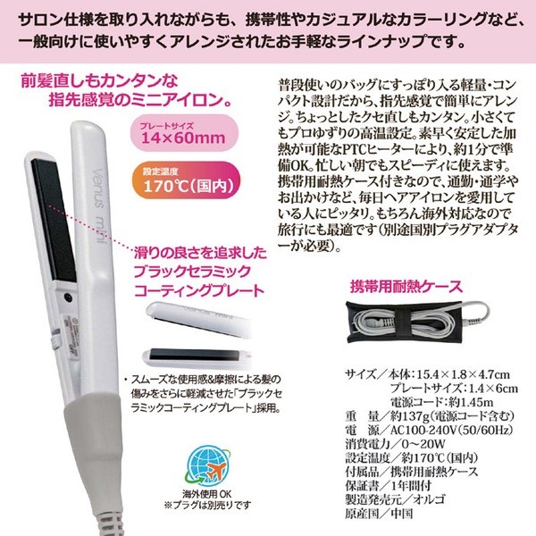 普段使いのバッグにすっぽり入る軽量・コンパクト設計だから、指先感覚で簡単にアレンジ。ちょっとしたクセ直しもカンタン。小さくてもプロゆずりの高温設定。素早く安定した加熱が可能なPTCヒーターにより、約1分で準備OK。忙しい朝でもスピーディに使えます。携帯用耐熱ケース付きなので、通勤・通学やお出かけなど、毎日ヘアアイロンを愛用している人にピッタリ。もちろん海外対応なので旅行にも最適です(別途国別プラグアダプターが必要)。