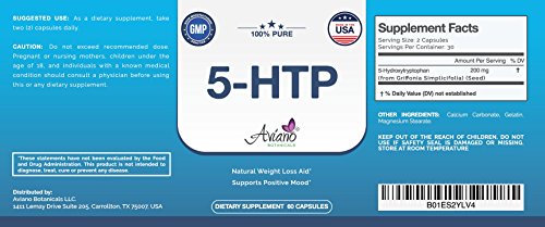 -. Feature : PREMIUM 5-HTP SUPPLEMENT: 100mg per capsule with 60 capsules in the bottle. Helps your brain produce a neurotransmitter called serotonin which supports positive mood, outlook on life, sleep, anxiety, balance, depression and a sense of well being. 5-HTP may also promote fat and weight loss by suppressing appetite. / PHARMACEUTICAL GRADE: At Aviano Botanicals, we insure that we use pharmaceutical grade and 100% pure ingredients in all our dietary vitamin supplements. / QUALITY ASSURED: Proudly made in the USA in a strict quality controlled GMP & FDA Certified Lab to insure the best supplement for your body. / 100% SATISFACTION GUARANTEE: If for any reason you are not satisfied with this supplement, we will give you a full refund! We stand behind all our quality supplements. / DIRECTIONS: Take 1-2 Capsules daily as a Dietary Supplement. Do Not Exceed 2 Capsules per day. Bottle comes with 60 (100mg) capsules.