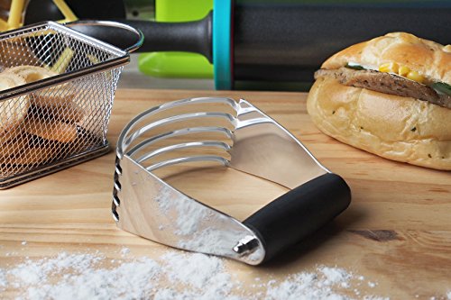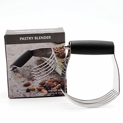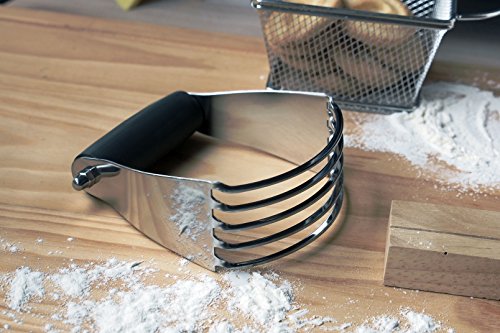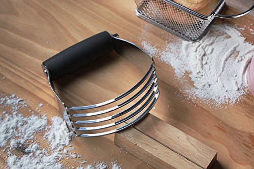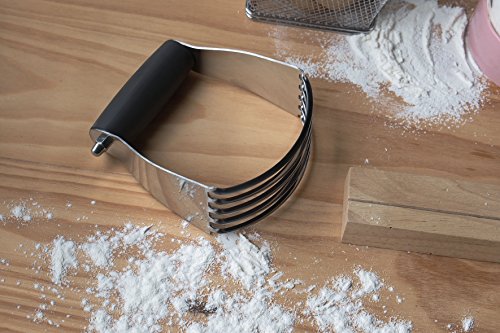 Product Description Material: Rust-resistant food grade 430 stainless steel Heat resistant pp handle with TPR Size: Entire dough blender is approx 4 3/4 inches long and approx 4 inches wide Handle 3 inches wide \ 1 inch thick Blades are 4 inches wide, approx 1 1/2 inches thick, 1/4 inch apart from each other 0