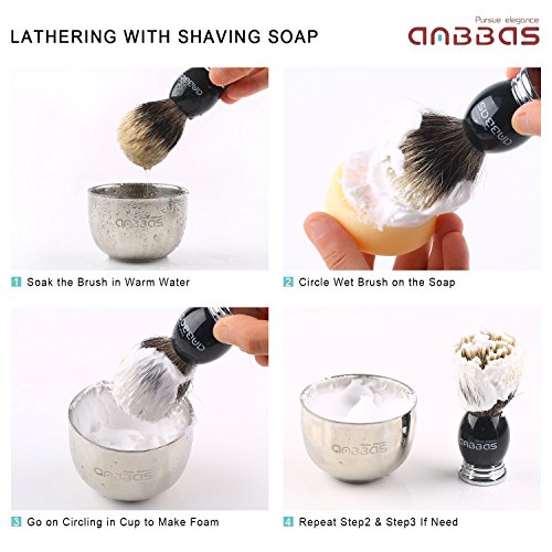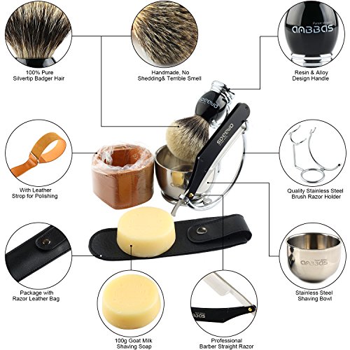 Shaving Set,7in1 Anbbas Silver tip Badger Shaving Brush,Natural Shaving Soap 100g,Stainless Steel Shaving Stand and Bowl,Straight Razor,Genuine Leather Razor Strop,Black Quality Razor Bag Kit