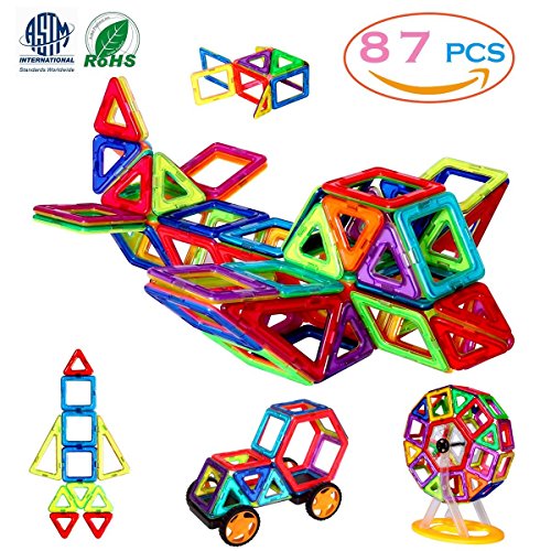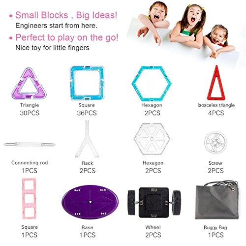 Total 87 Pieces: with 2 Cars and 1 Ferris Wheel, 36 squares, 30 triangles, 4 long triangle, 2 Hexagons, 1 three times square . An idea booklet included for your easy reference to build various kinds of models . Compatible with other similar-size tiles, such as Magformers and Picasso, etc.