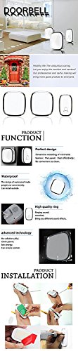 -. Feature : 1 transmitter button triggers (rings) and 2 chime units (receiver). The 2 chime units can each be configured to ring with different melodies/ringtones. / A perfect use case scenario for this product would be if you have a first floor and basement, garage, or second floor and you want both areas to ring from someone pressing a single transmitter button. / 36 different ring tones. Operating range of over 900 feet (280m) in open area. 5 levels of adjustable volume from 0db to 85db. IP44 weatherproof (Remote transmitter button, acceptable for outdoor use). / Easily plug receiver into an electrical outlet (no batteries required for main receiver). CE, FCC, RoHS certified.