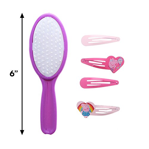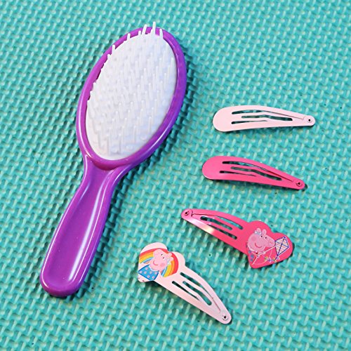 This set comes with 4 hair clips and a hair brush featuring adorable images of your favorite little pig, Peppa. Your little girl will look great and feel a boost in confidence with this cute dress up hair accessory set.