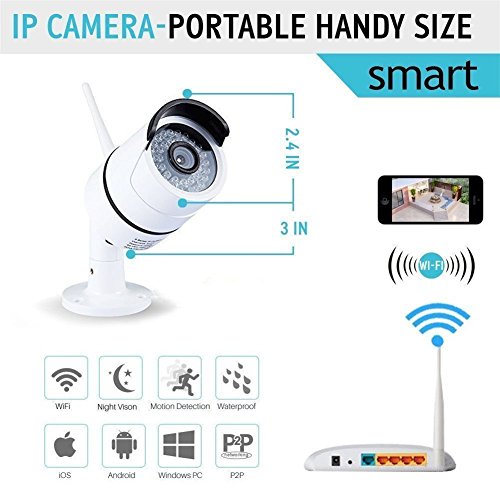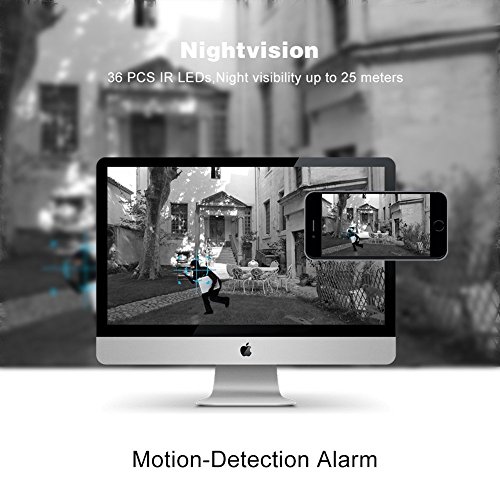 NIGHT VISION& MOTION DETECTION: Dual IR-CUT Filter auto switch, continuous day/night surveillance is accomplished with IR LEDs for night vision up to 65ft(20 meters ), The wireless IP security camera allows you viewing and recording live video even in complete darkness. Motion detection sensibility can be adjusted by yourself, When the surveillance system camera detected abnormity or alarm is triggered, instant alarm pictures will be sent via E-Mail, FTP. Perfect for surveillance!