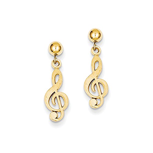 Share a melody with a musical symbol styled in satin and polished 14k yellow gold. This dangling earring is approximately 6mm (1/4 inch) in width by 21mm (13/16 inch) in length, which includes the 3mm ball stud. Made in the U.S.A.Feature