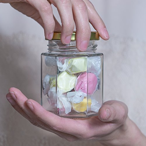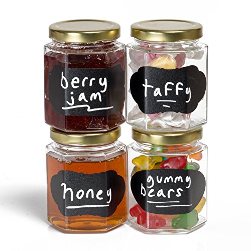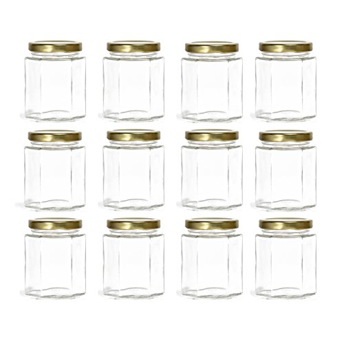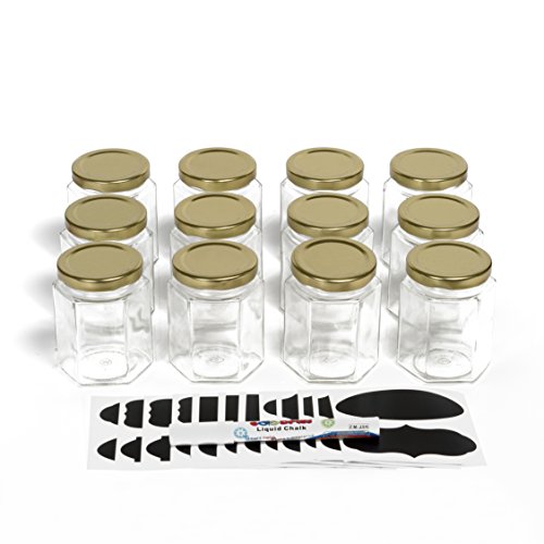 Hexagon Glass Jars for Spice Storage, Candy, Canning - 6 oz, 12 Jar Bulk Set - Containers with Gold Lids + Chalkboard Sticker Labels and Chalk Pens - Make DIY Jam, Candles, Honey, Herbs, Spices