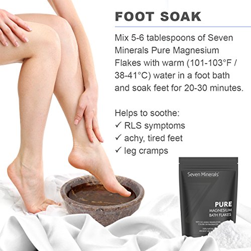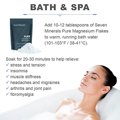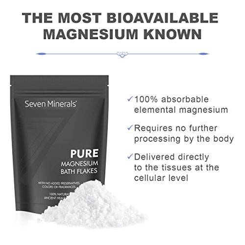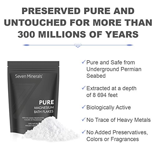 -. Feature : THE PUREST UNDERGROUND MAGNESIUM FLAKES: You may not be able to go back 300 million years to soak among the healing Permian waters, but you've found the closest thing. Extracted at a depth of 8694 feet from an untouched watershed, Seven Minerals Magnesium Chloride Flakes contain no toxic heavy metals, added preservatives, colors, bleaching or fragrances. Just pure, unprocessed minerals for an ancient healing soak. / SUPERIOR TO EPSOM SALT: Our cells love Magnesium Chloride! It's easier to absorb, our body utilizes it better, and excreted slower. This makes it a better option to increase our magnesium levels at a deep cell level. While epsom salt (Magnesium Sulfate) effects are short lived, elemental Magnesium Chloride is immediately delivered to all tissues, and sticks around to finish the job of boosting cell levels properly. / RELIEVE RESTLESS LEGS, INSOMNIA, CRAMPS, ANXIETY, ARTHRITIS AND MORE! Over 300 biochemical reactions in the body need magnesium. When low, the effects are felt everywhere. Pure Magnesium Bath Flakes can boost levels and help with sore muscles & feet, joint pain, fibromyalgia, tension, stress, psoriasis, headaches, migraines and more! It supports detoxification, and brings deep relaxation after a busy day. / ENJOY SOAKING IN THE BATH OR A SOOTHING FOOT SOAK: Add it to a bath for a relaxing full body melt. Or use in a foot soak tub for sore feet, dry feet and fungal conditions. Our Bath Flakes dissolve fast. So your skin rapidly absorbs elemental Magnesium, and ionic Chloride - one of our body's fluid balancing electrolytes. / 100% MONEY BACK GUARANTEE: This is simply the most relaxing, nutrient boosting bath flakes you've found on your search. Enjoy it's 100% purity and total ancient healing properties. If for some reason you're not totally satisfied, simply contact us for return or replacement. Order Now.