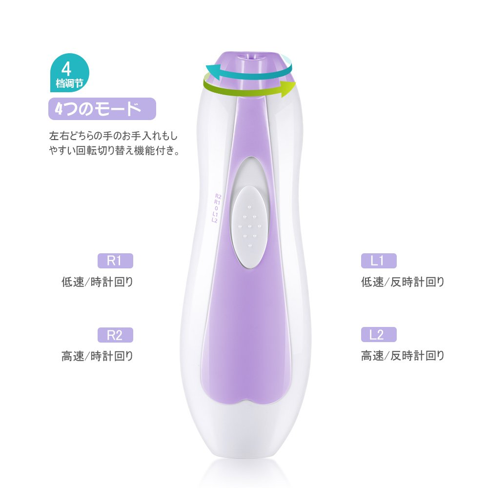 【多様な動作モード】 便利な2段階スピード設定で高速モードと低速モードがあります。 回転方向は左右に切り替えができるので、方向を気にせず左右どちらの手のお手入れもしやすいです。