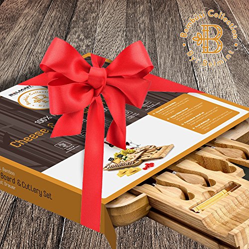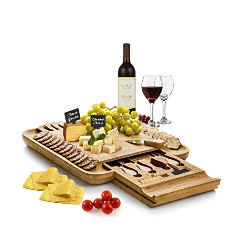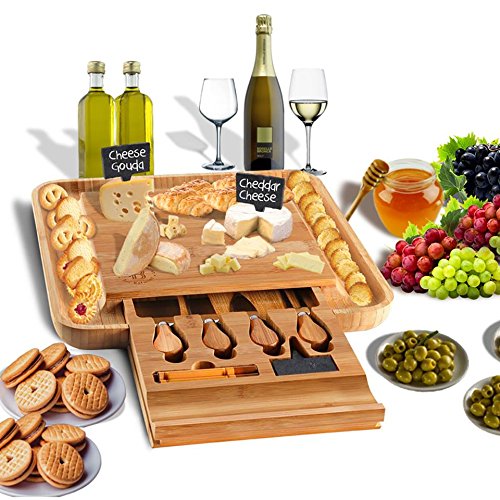 ★ THE EXCLUSIVE CHOICE FOR SERVING CHEESE - The key to enjoy slices of Italian Ricotta, English Cheddar, or French Vacherin with a glass of wine for holiday entertaining is to have our modern bamboo cheese knife set. Bordered by grooves that hold crackers, nuts, or olives and designed with a hidden drawer with four utensils with labels and chalk slate, this bamboo-crafted tray will make a perfect serving board for entertaining guest