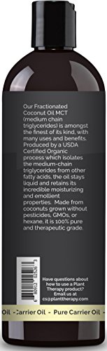 100% PURE USDA CERTIFIED ORGANIC FRACTIONATED COCONUT OIL: Plant Therapy's Organic Fractionated Coconut MCT (Medium-Chain Triglyceride) Oil is the only available one on the market that is USDA Certified Organic and is a customer favorite as an essential oil base.