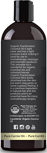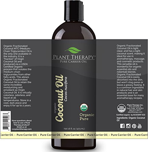 USDA CERTIFIED ORGANIC FRACTIONATED COCONUT OIL Fractionated Coconut Oil is a customer favorite, and now Plant Therapy is offering this oil in organic form. This is the only Organic Fractionated Coconut MCT (Medium-Chain Triglyceride) Oil available in the industry. What sets this Organic Fractionated Coconut Oil apart from other fractionated carrier oils is the extraction method. It is extracted using a USDA NOP (National Organic Program) process that does not use chemicals or heat to separate certain chains of fatty acids. This process refines, clarifies, and deodorizes the oil. Organic Fractionated Coconut Oil will always remain liquid regardless of temperature. It will not solidify. ORGANIC ESSENTIAL OILS BASE Organic Fractionated Coconut Oil is light, clear, and has a light coconut scent, making it ideal for an organic essential oil base. This versatile carrier oil is wonderful for organic essential oils and rollerball blends. Organic Fractionated Coconut Oil is easily absorbed into the skin, but won't clog pores or leave a greasy feeling. It is a common ingredient in natural hair and skin products and is an essential base for many aromatherapy recipes. EASY TO USE Organic Fractionated Coconut Oil readily penetrates skin, making it perfect for rollerball essential oil blends, creams, and lotions. Use with any of Plant Therapy's organic single essential oils, organic synergies, or DIY projects for a 100% organic product. Organic Fractionated Coconut Oil can be used at 100% strength. Add 10 drops of Organic Lavender to a rollerball bottle and fill the rest of it with Organic Fractionated Coconut Oil; place the ball back on the bottle and take your Organic Lavender Roll-On with you wherever you go. SHELF LIFE Unlike most other carriers, Organic Fractionated Coconut Oil is extremely resistant to rancidity. The shelf life is at least 2 years and is probably more under proper storage conditions (cool, out of direct sunlight). Refrigeration is not needed.Feature