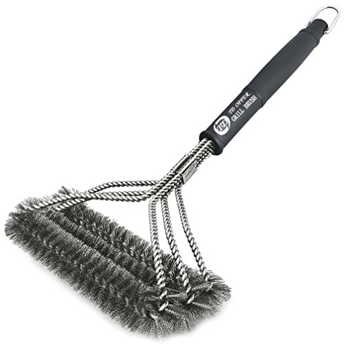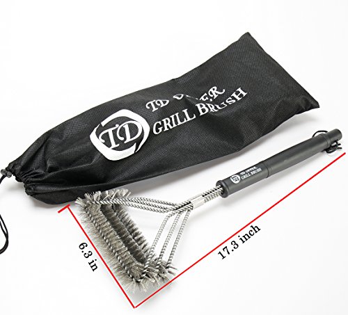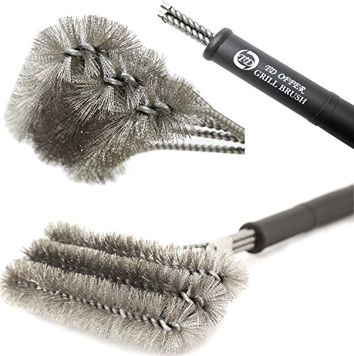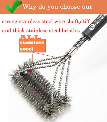 NEW DESIGN :Six 17” stainless steel shafts.Wide brush head with three thick stainless steel wire brushes for more effective and uniform pressure (longer lasting bristles) on grill grate