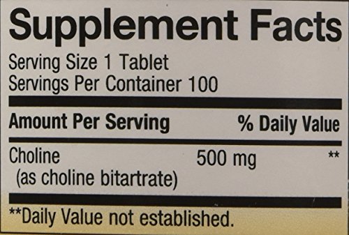 -. Binding : Health and Beauty -. Brand : Nature's Way -. Feature : 2 Bottles of 100 tablets / Choline is an essential precursor to acetylcholine, a stimulatory neurotransmitter / Nature's Way -. Label : NATURE'S WAY -. Manufacturer : NATURE'S WAY -. ProductGroup : Health and Beauty -. ProductTypeName : HEALTH_PERSONAL_CARE -. Publisher : NATURE'S WAY -. Studio : NATURE'S WAY -. Title : Nature's WAY Choline 500mg 100 Tabs