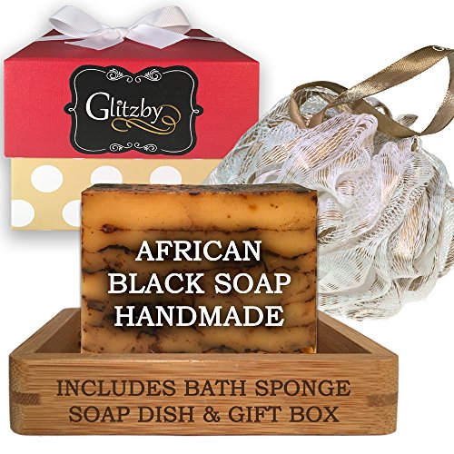 African Black Soap - Luxury Handmade Soap Bath Gift Set - Includes Loofah & Bamboo Soap Dish