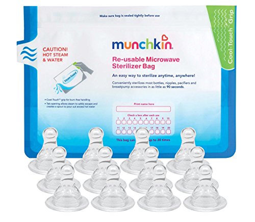-. Feature : Helps reduce colic with vented nipple design / Vent holes and ribs help ensure smooth flow and help prevent nipple from collapsing / Fits most standard reusable bottles / An easy way to sterilize anytime, anywhere; Sterilizes bottles, nipples, pacifiers and breast pump accessories; Bag can be reused up to 20 times / Features the Cool Touch grip for burn free handling