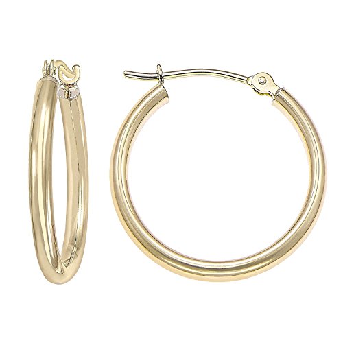 14k Yellow Gold Classic Shiny Polished 1 inch Round Hoop Earrings, 2mm tube. High Polish.