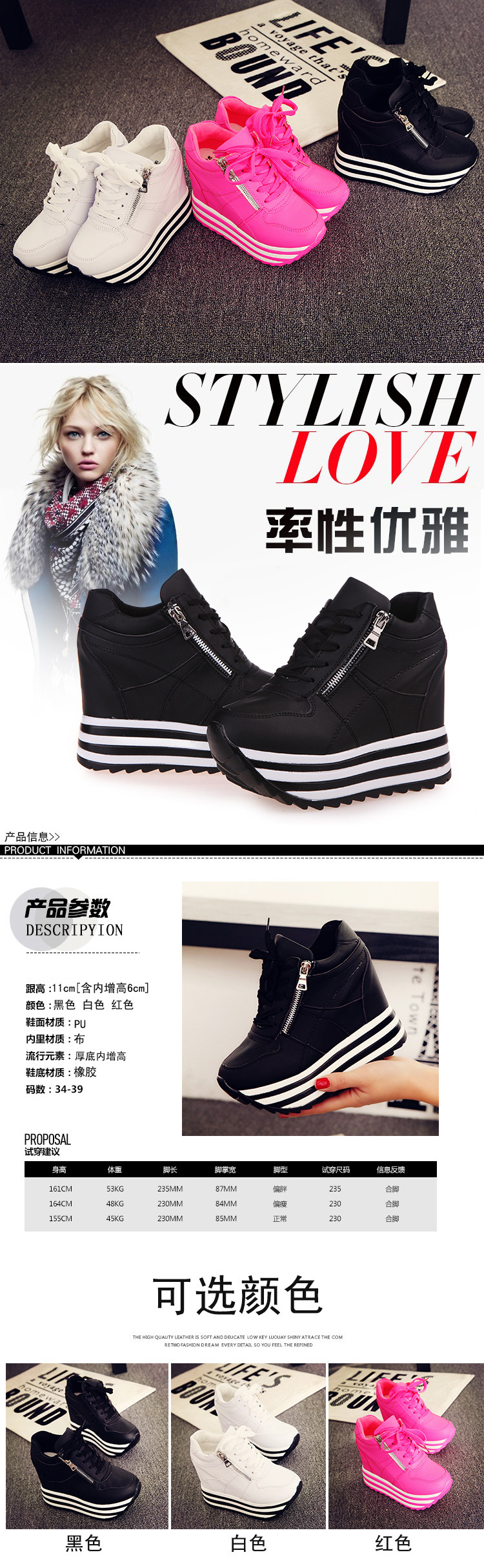 2016新款韩版厚底超高跟12CM内增高女鞋休闲真皮拉链松糕底34码单