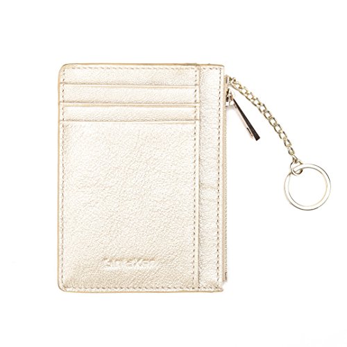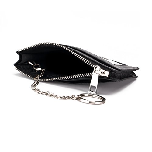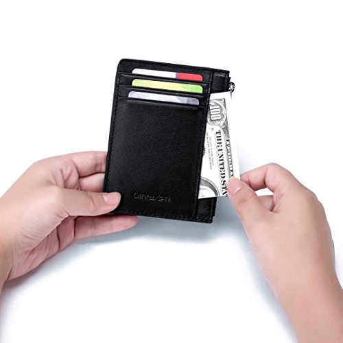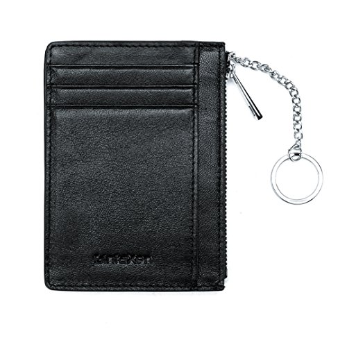 -. Feature : Top grain cowhide leather zipper pocket wallet, expertly handcraft, top quality, feels great and looks beautiful / Small size, 4-5/8'' x 3-3/8'' x 1/4''; Big capacity: 5 card slots, 1 ID window,2 money pockets,1 middle zipper pocket, 1 removable key chain / Minimalist slim style but powerful function, can hold 6-10 cards, 10+ folded bills, some coins, keys, lips etc. / RFID blocking front pocket wallet, protects you from the data crimes, keep your money safe / Covered by our 2 Years Warranty