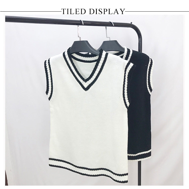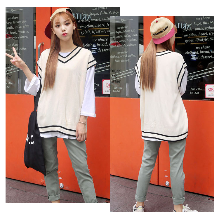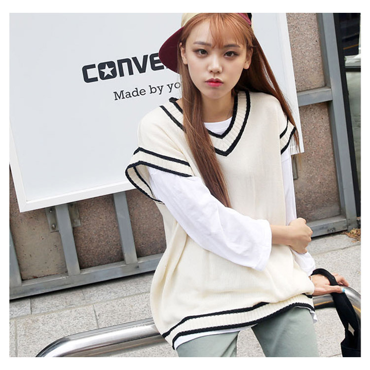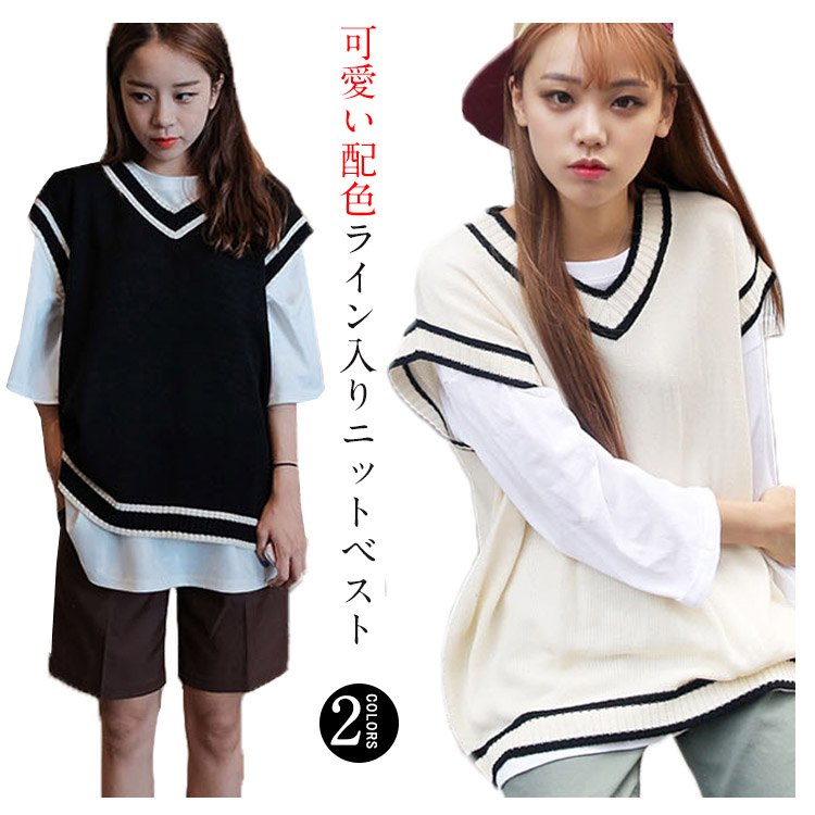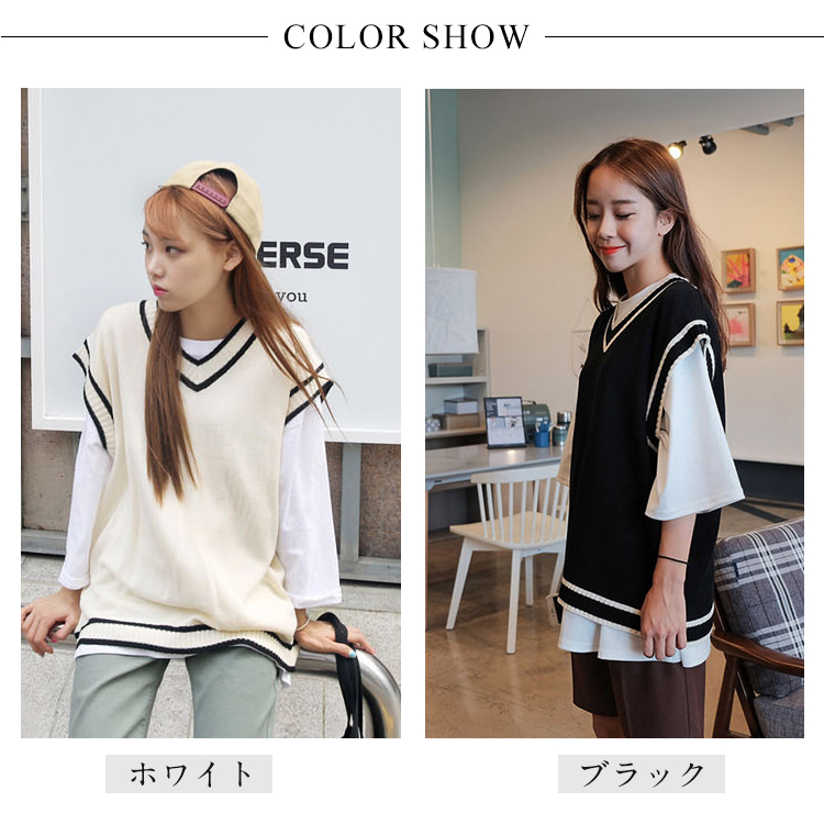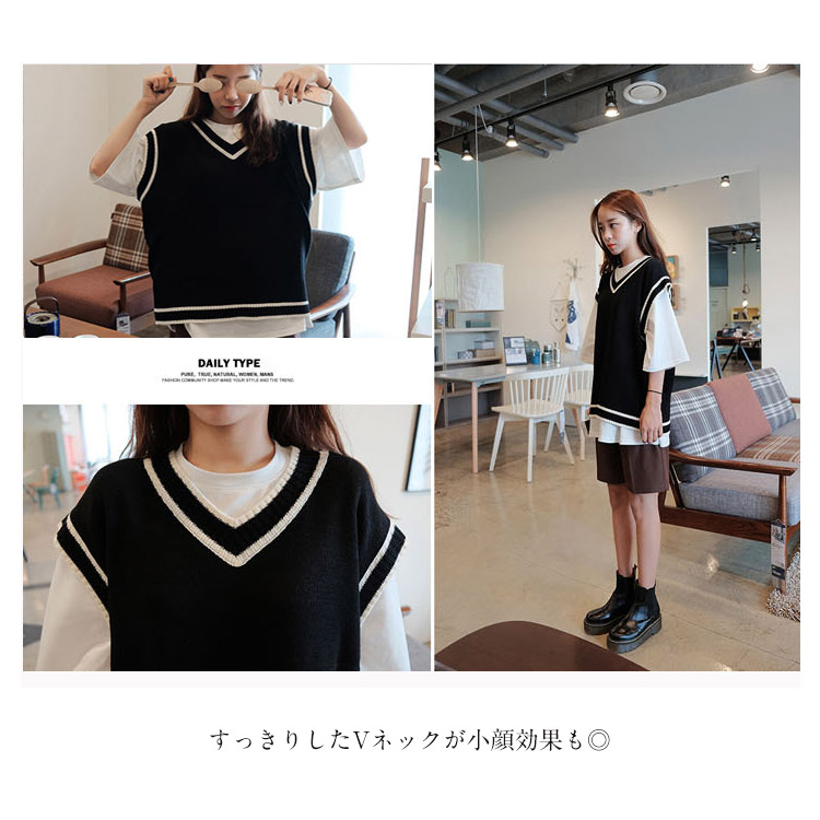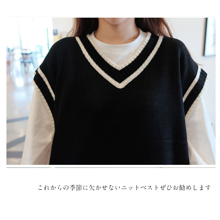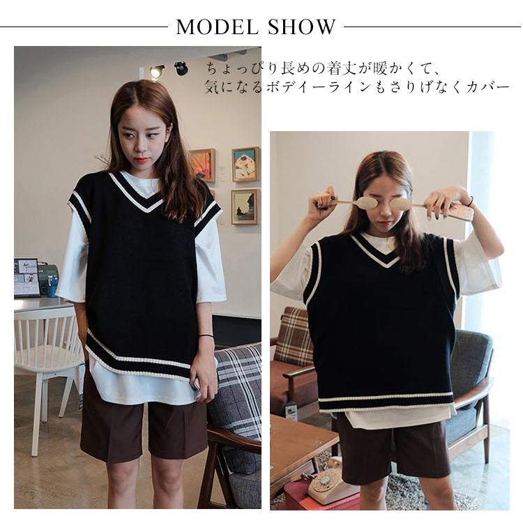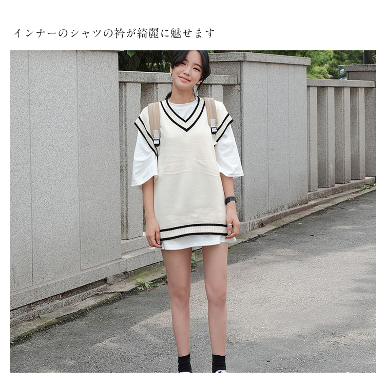 | 可愛い配色ライン入りニットベストちょっぴり長めの着丈が暖かくて、気になるボデイーラインもさりげなくカバーすっきりしたVネックが小顔効果も◎インナーのシャツの衿が綺麗に魅せますこれからの季節に欠かせないニットベストぜひお勧めします | |