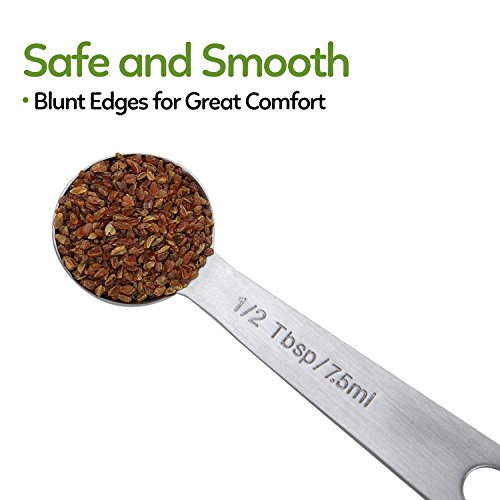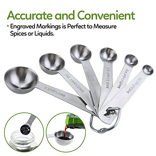 Easy to use and store: These spoons have engraved U.S. and metric measurement which are easy to read and won't fade or rub off like plastic. They nest together for compact storage and come with a convenient ring that opens and closes to let you use one spoon at a time and then keep them all together when you're done.