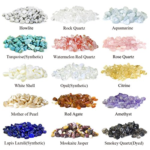 Gemstone includes: aquamarine, rose quartz, citrine, amethyst, smokey quartz(dyed), rock quartz, watermelon red quartz, opal(synthetic), red agate, mookaite jasper, howlite, turquoise(synthetic), white shell, mother of pearl and lapis lazuli(synthetic).