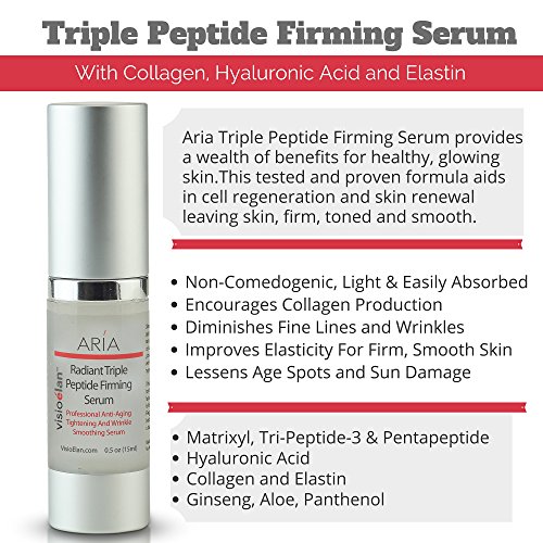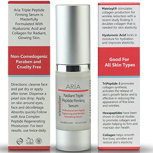 • REDISCOVER RADIANT SKIN! Aria Firming Serum contains 3 peptides, Matrixyl, Palmitoyl Tripeptide-3 and Pentapeptides plus collagen and hyaluronic acid. These peptides are certain amino acids that rebuild connective tissue and encourage collagen production that’s been damaged by the sun and in aging. By adding collagen and hyaluronic acid, Aria masterfully hydrates and heals!