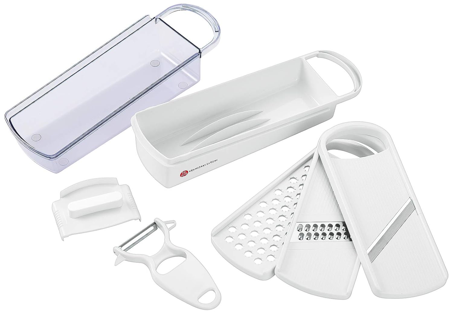 製品サイズ:幅8.5×奥行26.5×高8.7cm 刃部:ステンレス鋼、ピーラー刃:ステンレス刃物鋼、蓋:AS樹脂、ホルダー:ポリプロピレン、その他樹脂部:ABS樹脂 生産国:日本 セット内容:容器(蓋)、おろし器、スライサー、千切り器、ピーラー、ホルダー