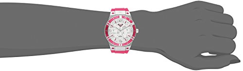 Pink bezel with graphics; mineral crystal lens; silver-tone patterned dial with pink indexes; silver-tone Arabic numerals and hands