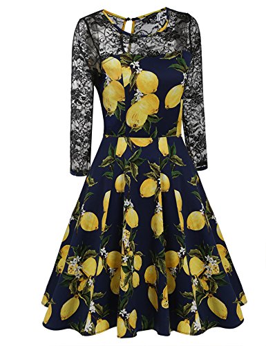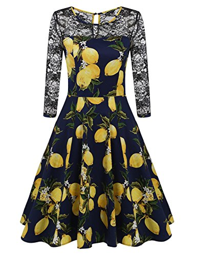 Feature : Material: 95% Cotton and 5% Spandex / Stretchy fabric, fit and flare, slim fit / O-neck, crochet lace patchwork 3/4 sleeve, vintage style floral tea dress / Garment Care: Hand-wash and Dry Clean / This swing dress is suitable for a variety of occasions. for example: Evening, Party, Clubwear