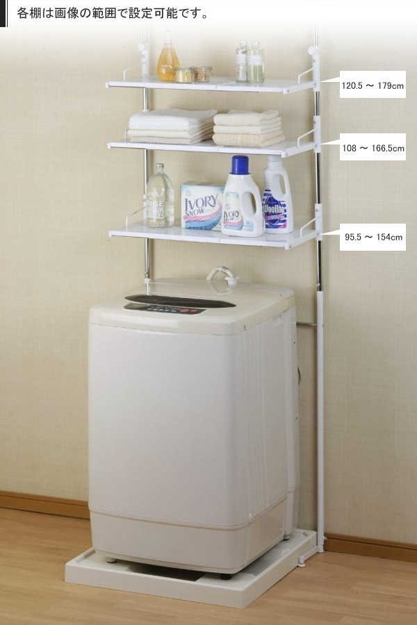 | 洗濯機は動かさずに、ラクラクと設置が可能です。脚元がそれぞれ伸縮しますので、段差にも対応できます。棚板は丈夫なABS樹脂製。汚れても簡単に洗えて便利です。 |