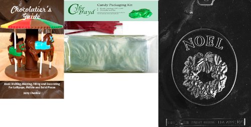 Cybrtrayd Noel with Wreath Chocolate Mold with Chocolatier's Bundle of 25 Cello Bags, 25 Red Twist Ties and Chocolatier's Guide