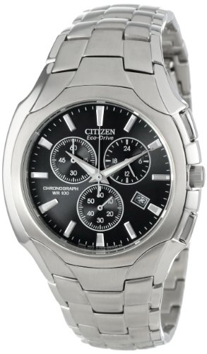 -. Feature : Stainless steel watch with black dial, screw-back case, and link bracelet / Japanese quartz movement with analog display / Eco Drive technology is fueled by light and it never needs a battery / Features push-button fold-over clasp closure, one-second chronograph measuring up to 60 minutes, 12/24 hour time, date window, and protective mineral crystal dial window / Water resistant to 330 feet (100 M): suitable for snorkeling, as well as swimming, but not diving