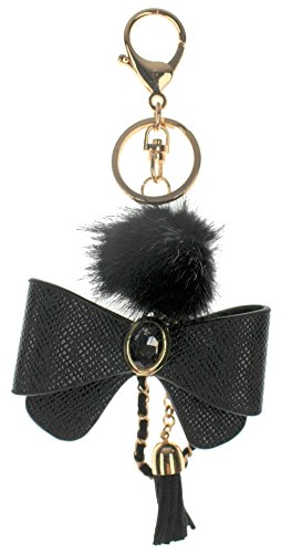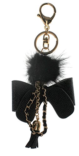(T Square)/Accessories/Wallets, Money Key Organizers/DIRECT FROM USA/Black Bow with Tassel and Fur Puff Key Chain Fob Phone Purse Charm Gold Toned