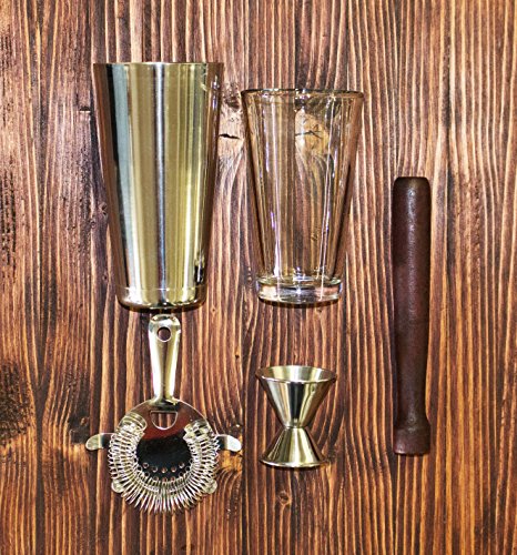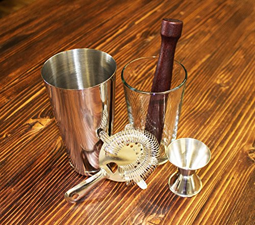 Studio : 2dayShip Publisher : 2dayShip Product Description This stainless steel and rim tempered glass bar set is a must have for your professional or home bar. This set includes several necessary pieces to start making your own classic cocktails! Set includes: 30 oz cocktail shaker, 16 oz rim tempered mixing glass, stainless steel jigger ( 3/4 x 1-1/2 oz), stainless steel 4 prong Julep Strainer, long red bar spoon, stainless steel speed opener, stainless steel waiters corkscrew, and 6 black liquor bottle pourers. 0
