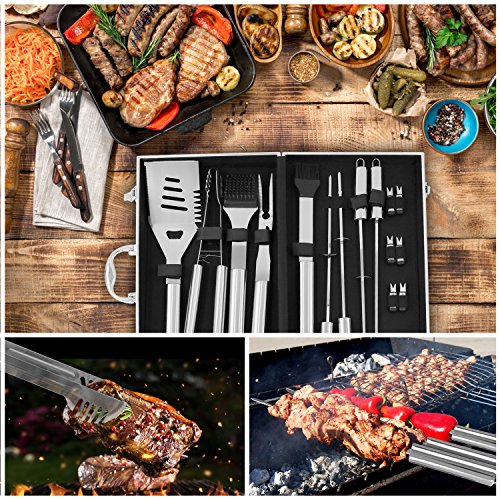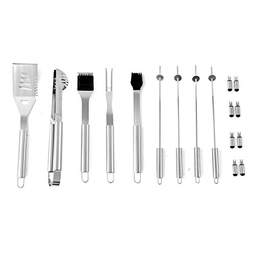 COOKING AND CLEANING: Our BBQ grilling kit has a good variety of utensils convenient for any type of cooking - charcoal or gas grill, rotisserie, kabob and even your smoker. Contents include spatula, tongs and skewers for cooking and a grill brush for cleaning. Also 8 pieces of corn holders, poking fork and a silica sauce brush.