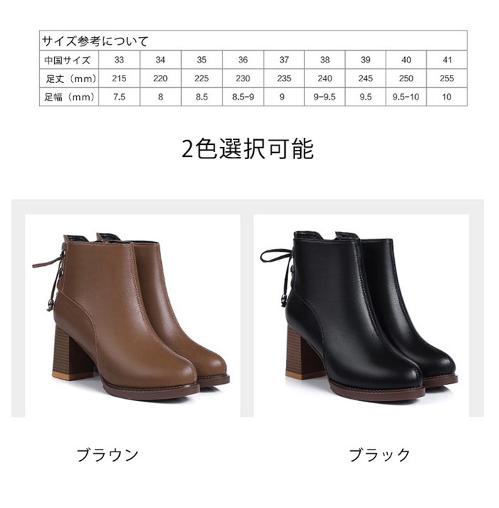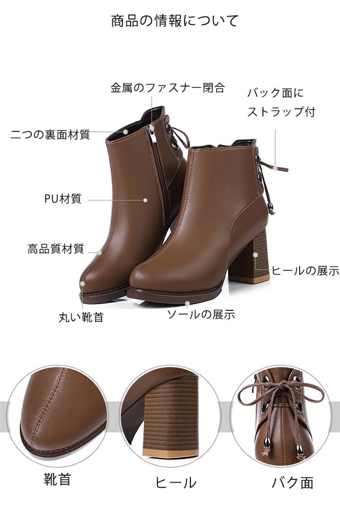 材質:PU裏面:ナイロン、コットンソール:TPRゴムソール靴首:丸い色:ブラック、ブラウン閉合方式:側面にファスナー付きヒールの高さ:7.5cm約ヒールの種類:快適なヒール商品内容:1*靴サイズ:34:22cm 35:22.5cm 36:23cm 37:23.5cm 38:24cm 39:24.5cm 40:25cmショートブーツレディース ヒール 女性のアンクルブーツ シューズ ファスナー式靴 秋冬物 シンプル くつレディース用のアンクルブーツが登場カラーもシルエットもとても組み合わせしやすくて、どんな場合にも使える上品な一足