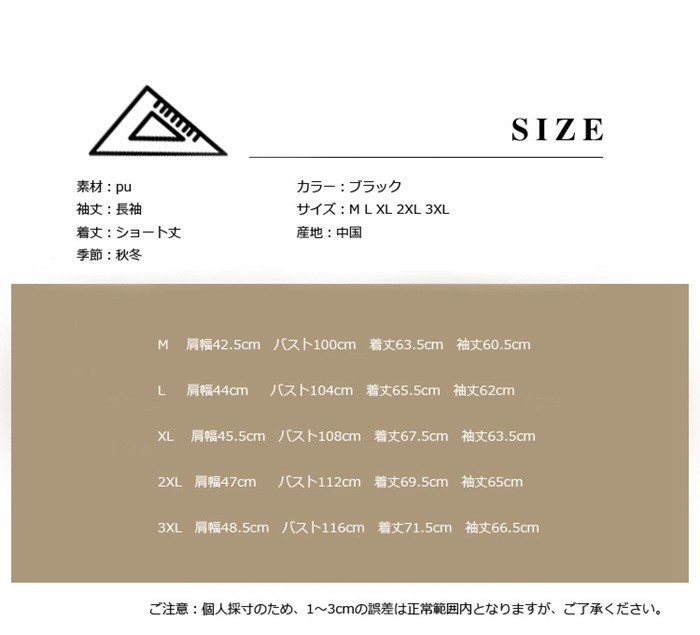 ライダースジャケット メンズ レザージャケット ショート丈 フェイクレザージャケット 無地 pu革 秋冬アウター ブラック 黒 大きめ 革ジャン 新作 レザージャケット メンズ ショート丈 大きめ 秋冬アウター商品詳細素材:pu袖丈:長袖着丈:ショート丈季節:秋冬カラー:ブラックサイズ:M L XL 2XL 3XL産地:中国サイズ参照表M 肩幅42.5cm バスト100cm 着丈63.5cm 袖丈60.5cmL 肩幅44cm バスト104cm 着丈65.5cm 袖丈62cmXL 肩幅45.5cm バスト108cm 着丈67.5cm 袖丈63.5cm2XL 肩幅47cm バスト112cm 着丈69.5cm 袖丈65cm3XL 肩幅48.5cm バスト116cm 着丈71.5cm 袖丈66.5cmご注意:個人採寸のため、1~3cmの誤差は正常範囲内となりますが、ご了承ください。ライダースジャケット メンズ レザージャケット ショート丈 フェイクレザージャケット 無地 pu革 秋冬アウター ブラック 黒 大きめ 革ジャン 新作 レザージャケット メンズ ショート丈 大きめ 秋冬アウター