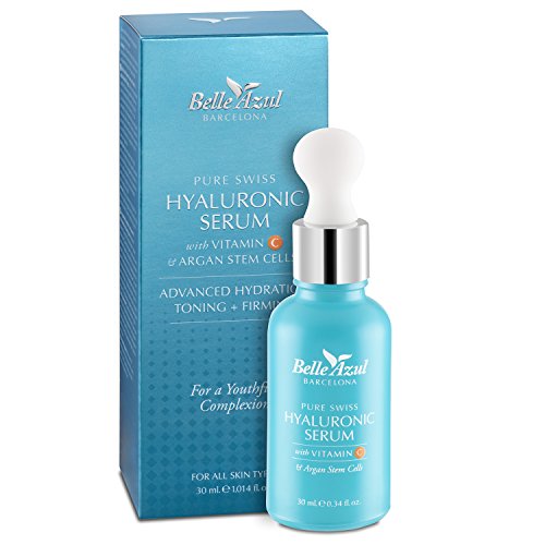 -. Binding : Health and Beauty -. Brand : Belle Azul -. EAN : 8415001029042 -. Feature : HIGHEST QUALITY HYALURONIC ACID is nature's most powerful moisture-binding ingredient and helps reverse the aging process by actively boosting skin hydration and strengthening outer layers of the dermis for softer, smoother and plumper looking skin. / RICH IN VITAMIN C and antioxidants to protect skin from damaging free radicals leading to premature aging. CLINICALLY PROVED to combat overproduction of melanin which leads to age spots and other hyperpigmentation / ARGAN STEM CELLS boost Collagen and Elastin production to rejuvenate and regenerate dermal skin cells for supple looking skin. Vitamin C and other active ingredients helps remove wrinkles and fine lines. / ANTI AGING SERUM deeply hydrates and nourishes for younger looking skin. Helps keep your face feeling smooth, fresh with an even skin tone. Advanced and effective facial serum / NON-GREASY FORMULA with matte finish provides an excellent base for makeup. Suitable for all skin types. MADE IN SPAIN: -. IsAdultProduct : 0 -. Label : Belle Azul -. Manufacturer : Belle Azul -. MPN : 1 -. PackageQuantity : 1 -. PartNumber : 1 -. ProductGroup : Beauty -. ProductTypeName : HEALTH_PERSONAL_CARE -. Publisher : Belle Azul -. Studio : Belle Azul -. Title : Belle Azul Pure Swiss Hyaluronic Acid Serum with Vitamin C and Argan Stem Cells. Reduces Wrinkles and Fine Lines. Increases Hydration for Supple Skin 30 ml / 1.014 fl oz