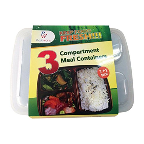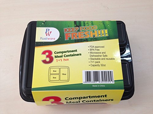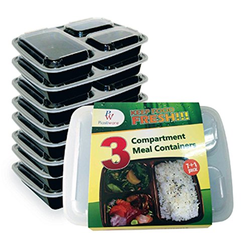 Plastiware Premium 3-compartment Plastic Food Storage Containers, with Lids, 7+1 Pack, Stackable, Reusable Lunch/bento Box, Black