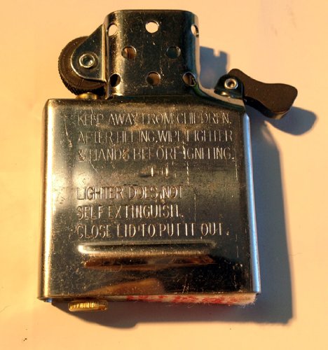 -. Binding : Health and Beauty -. Brand : Zippo -. Color : silver -. Feature : MADE IN AMERICA / FITS ANY REGULAR SIZE ZIPPO / ORIGINAL ZIPPO INSIDE GUTS / LIFETIME WARRANTY -. IsAdultProduct : 0 -. ProductGroup : Health and Beauty -. ProductTypeName : HEALTH_PERSONAL_CARE -. Title : Zippo Inside Guts Silver Chrome (No Outside Case) Only Inside Insert