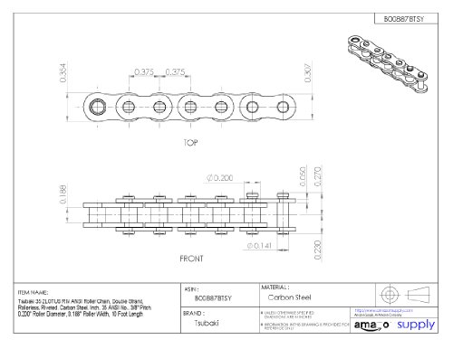 Tsubaki 35-2LOTRB ANSI Roller Chain, Double Strand, Rollerless, Riveted, Carbon Steel, Inch, #35 ANSI No., 3/8" Pitch, 0.200" Roller Diameter, 0.188" Roller Width, 10ft Length