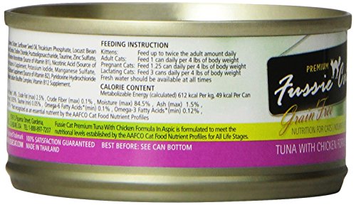 Promotes a healthy digestive system with prebiotic fructooligosaccharides Made in human consumables manufacturing plant Choice cuts of quality tuna White meat chicken Grain-free and rich in DHA Brand : Fussie Cat Item model num : FCC001 MPN(PartNumber) : FCC001 EAN : 0888641130603
