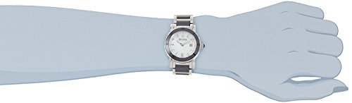These elements surround a mother-of-pearl dial, which is protected by a mineral crystal and features with eight diamond hour markers along with silver-toned luminous hands powered by Japanese quartz movement