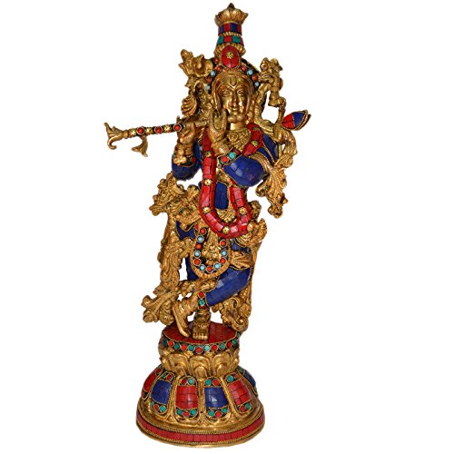 Large Flute Krishna Statue Hindu God Religious Figurine Idol Turquoise Handwork