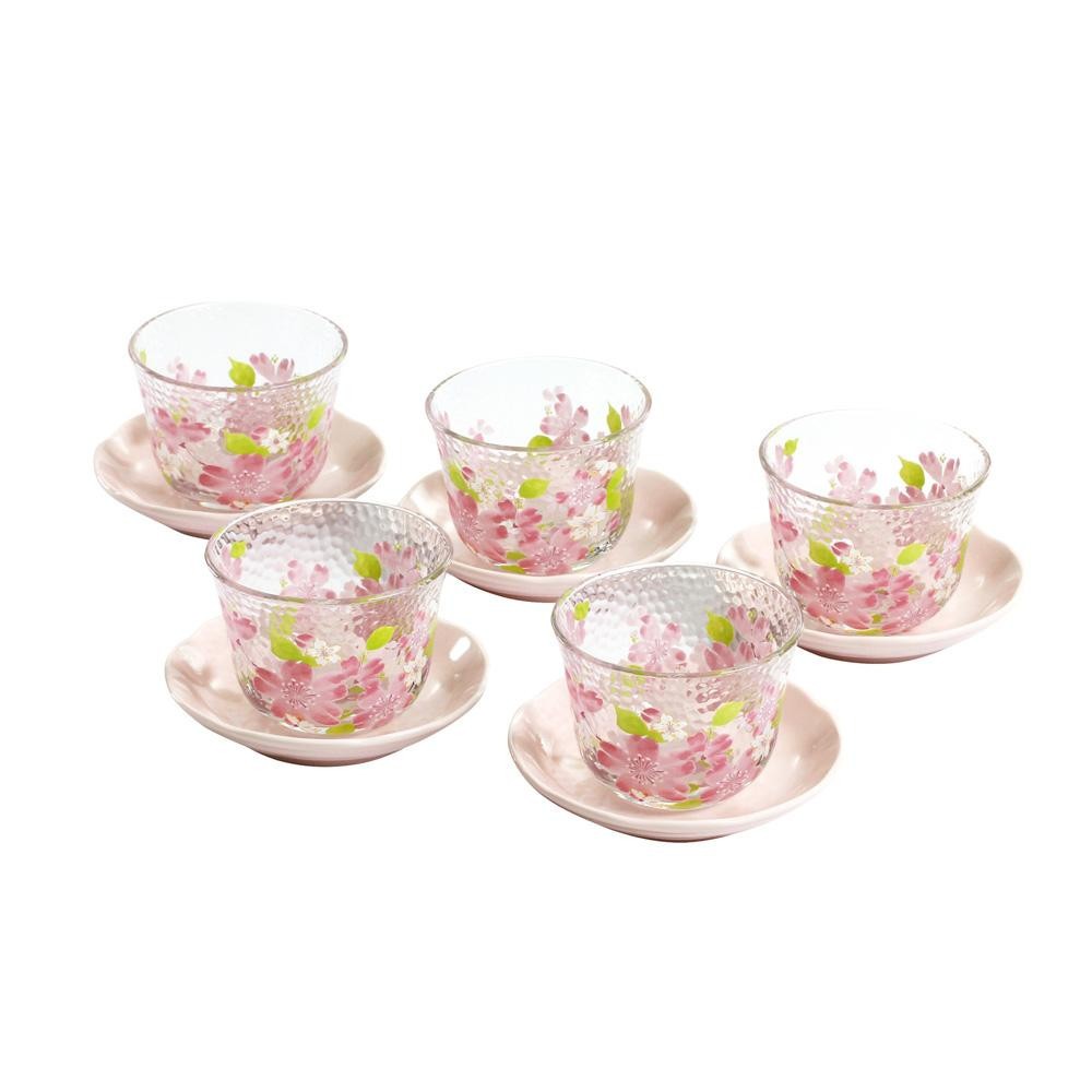 桜のピンクと葉の緑が鮮やかに描かれたガラスの冷茶カップとピンクの磁器茶托の5客セットです。